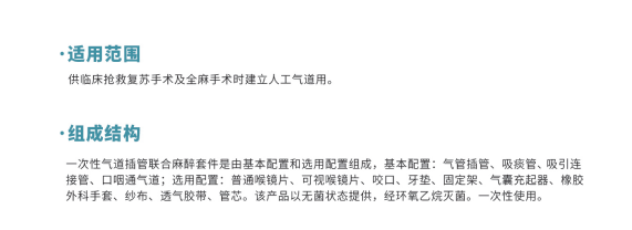 一次性氣道插管聯合麻醉套件是由基本配置和選用配置組成,基本配置:氣管插管、吸痰管、吸引連接管、口咽通氣道;選用配置:普通喉鏡片、可視喉鏡片、咬口、牙墊、固定架、氣囊充起器、橡膠外科手套、紗布、透氣膠帶、管芯。該產品以無菌狀態提供,經環氧乙烷滅菌。一次性使用。