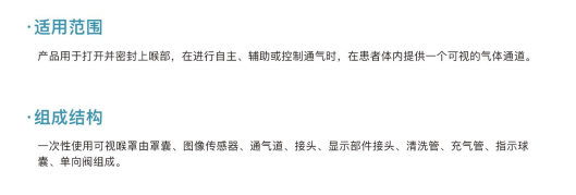 一次性使用可視喉罩由罩囊、圖像傳感器、通氣道、接頭、顯示部件接頭、清洗管、充氣管、指示球囊、單向閥組成,產(chǎn)品經(jīng)環(huán)氧乙烷滅菌,一次性使用。
