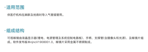 可視喉鏡由液晶顯示器(鋰電、電源管理及系統控制電路板)、手柄、支撐管(含攝像頭和光源)、及喉鏡片組成。軟件發布版本njncV1908001.0,喉鏡片采用金屬不銹鋼制成。產品供醫療機構在麻醉及搶救時導入氣管插管用。