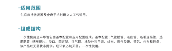 一次性使用全麻導管包由基本配置和選用配置組成,基本配置:氣管插管、吸痰管、吸引連接管,選用配置:咽喉鏡片、咬口、固定架、注氣筒、橡膠外科手套、紗布、透氣膠帶、管芯、包布和托盤。產品應無菌。