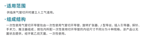 一次性使用氣管切開導管包由一次性使用氣管切開導管、旋轉擴張器、J型導絲、插入引導器、探針、手術刀、推注器組成;按包內所配一次性使用切開導管的內徑尺寸不同分為十種規格,該產品以無菌狀態提供,經環氧乙烷滅菌,一次性使用。