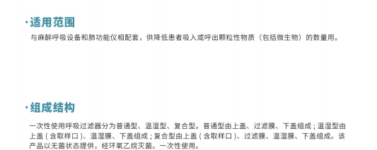 一次性使用呼吸過濾器分為普通型、溫濕型、復合型。普通型由上蓋、過濾膜、下蓋組成;溫濕型由上蓋(含取樣口)、溫濕膜、下蓋組成;復合型由上蓋(含取樣口)、過濾膜、溫濕膜、下蓋組成。該產品以無菌狀態提供,經環氧乙烷滅菌。一次性使用。