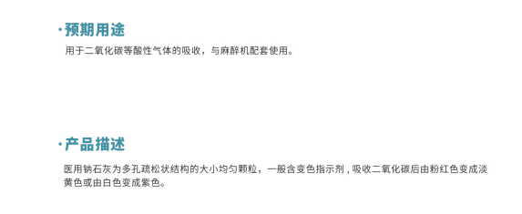 醫用鈣石灰為多孔疏松狀結構的大小均勻顆粒,一般含變色指示劑,吸收二氧化碳后由粉紅色變成淡黃色或由白色變成紫色